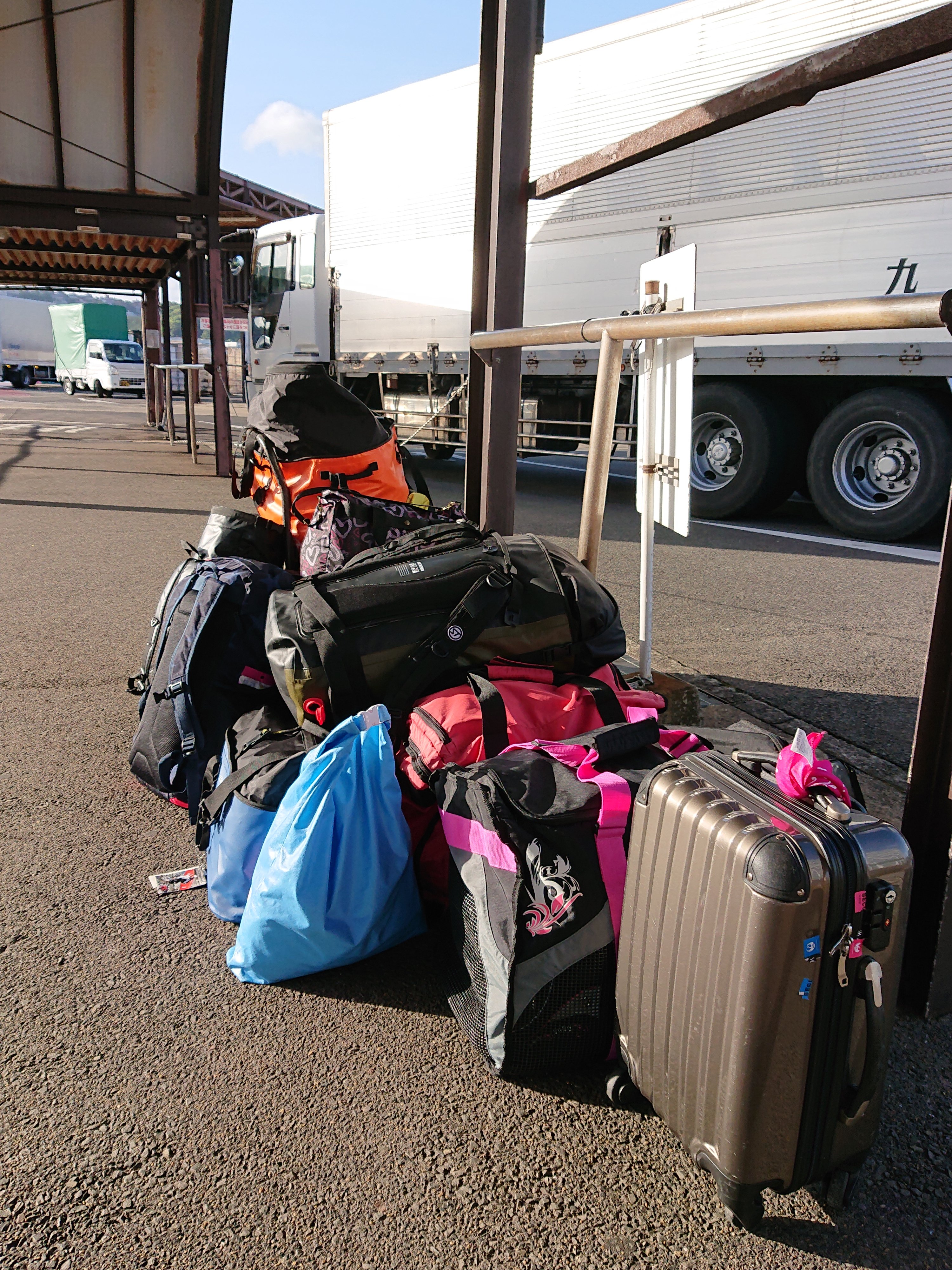 朝日に照らされた荷物群山積みです🌋